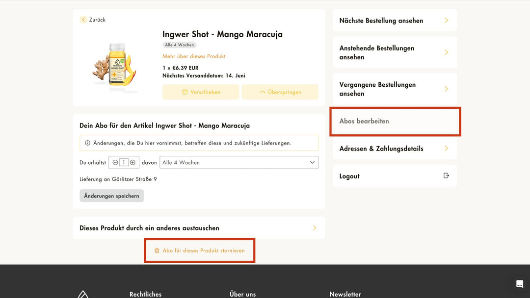 Logge Dich in Dein Kundenkonto ein und klicke dann oben auf "Abo verwalten". So gelangst Du zu einer Übersicht Deiner Abos und kannst diese bearbeiten.