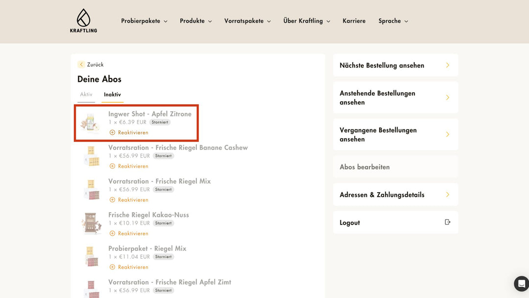 Du möchtest ein storniertes Produkt doch wieder im Abo erhalten? Wähle im Menü "Abos bearbeiten" und klicke auf den Reiter "Inaktiv". Hier kannst Du beim gewünschten Produkt auf "reaktivieren" klicken.