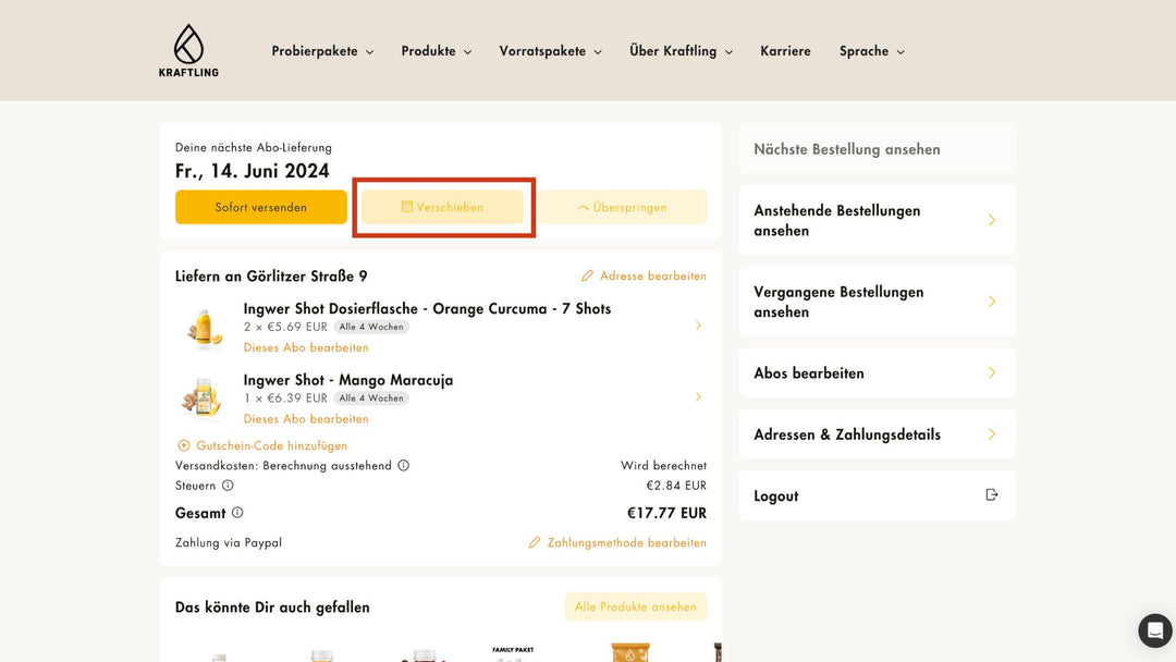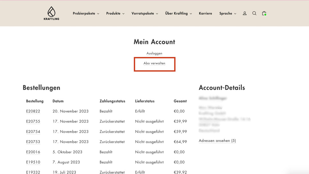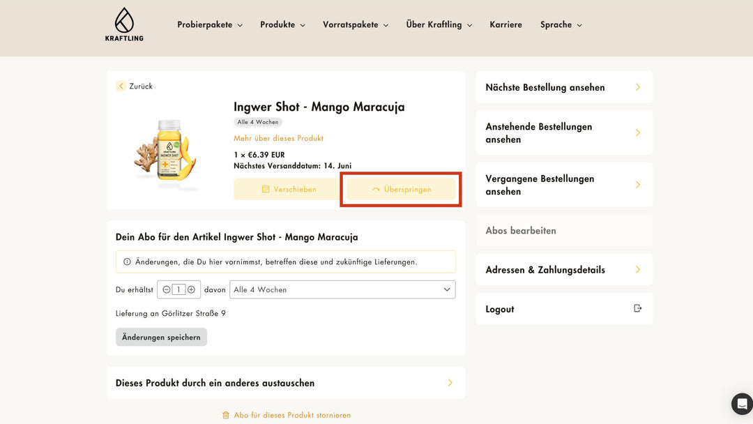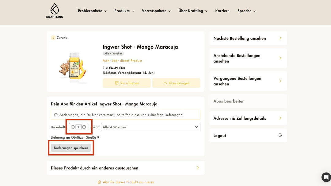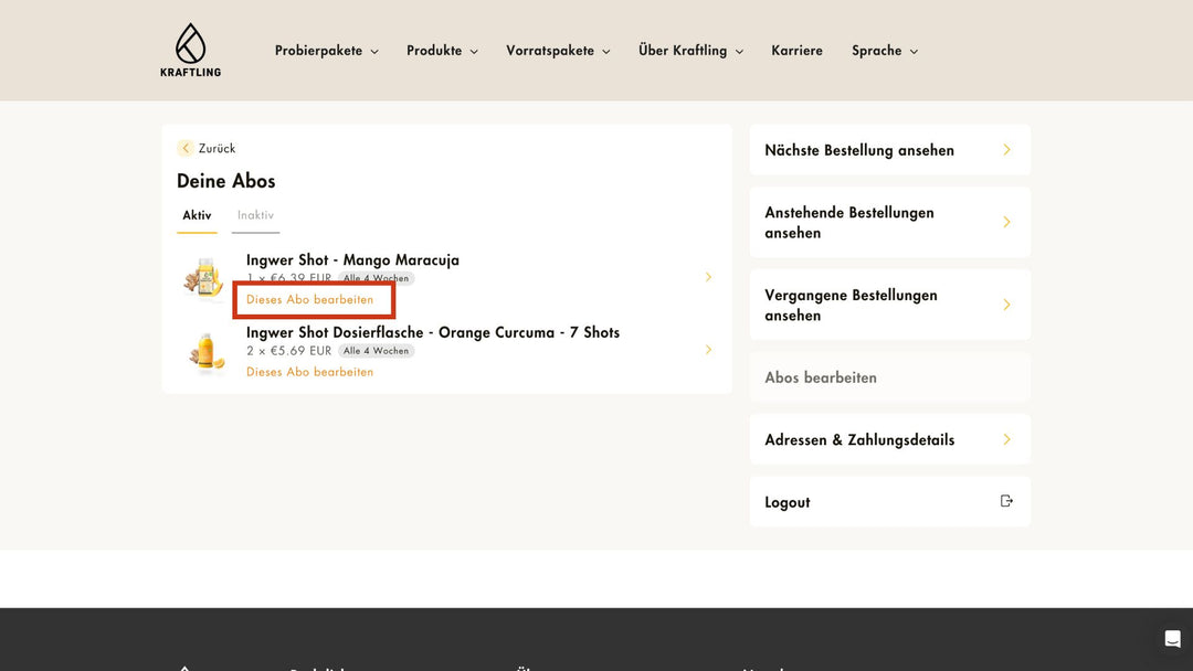 Du kannst Dein Abo jederzeit selbst mit nur wenigen Klicks in Deinem Kundenkonto anpassen. Hier zeigen wir Dir Schritt für Schritt alle wichtigen Abo-Funktionen. Falls Du doch einmal Hilfe benötigst, melde Dich gerne bei uns unter hallo@kraftlinge.com.