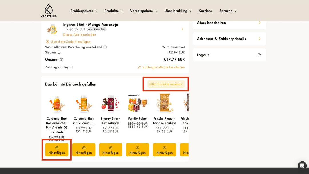 Wähle im Menü "Nächste Bestellung ansehen". Weiter unten findest Du Produktvorschläge. Du kannst hier über den Hinzufügen-Button ein Produkt zum Abo hinzufügen oder Dir unter "Alle Produkte ansehen" das gesamte Sortiment ansehen.